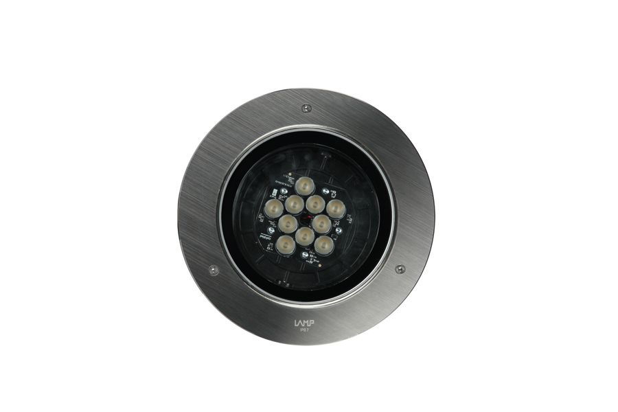 LAMP SHOT 80 outdoor projector. Manufactured from die-cast aluminum with a cataphoresis coating and tempered glass, stainless steel screws, and silicone gaskets. This model is designed for high-power LEDs, featuring a color temperature of 3000K, CRI 80, and integrated electronic control unit. It has medium flood optics, IP65 and IK06 protection ratings, and Class II insulation. Lifespan: 60,000 hours (L90B10). Bug Rate: B0 U0 G0, ULOR: 0%. Available finishes: anthracite and textured gray.