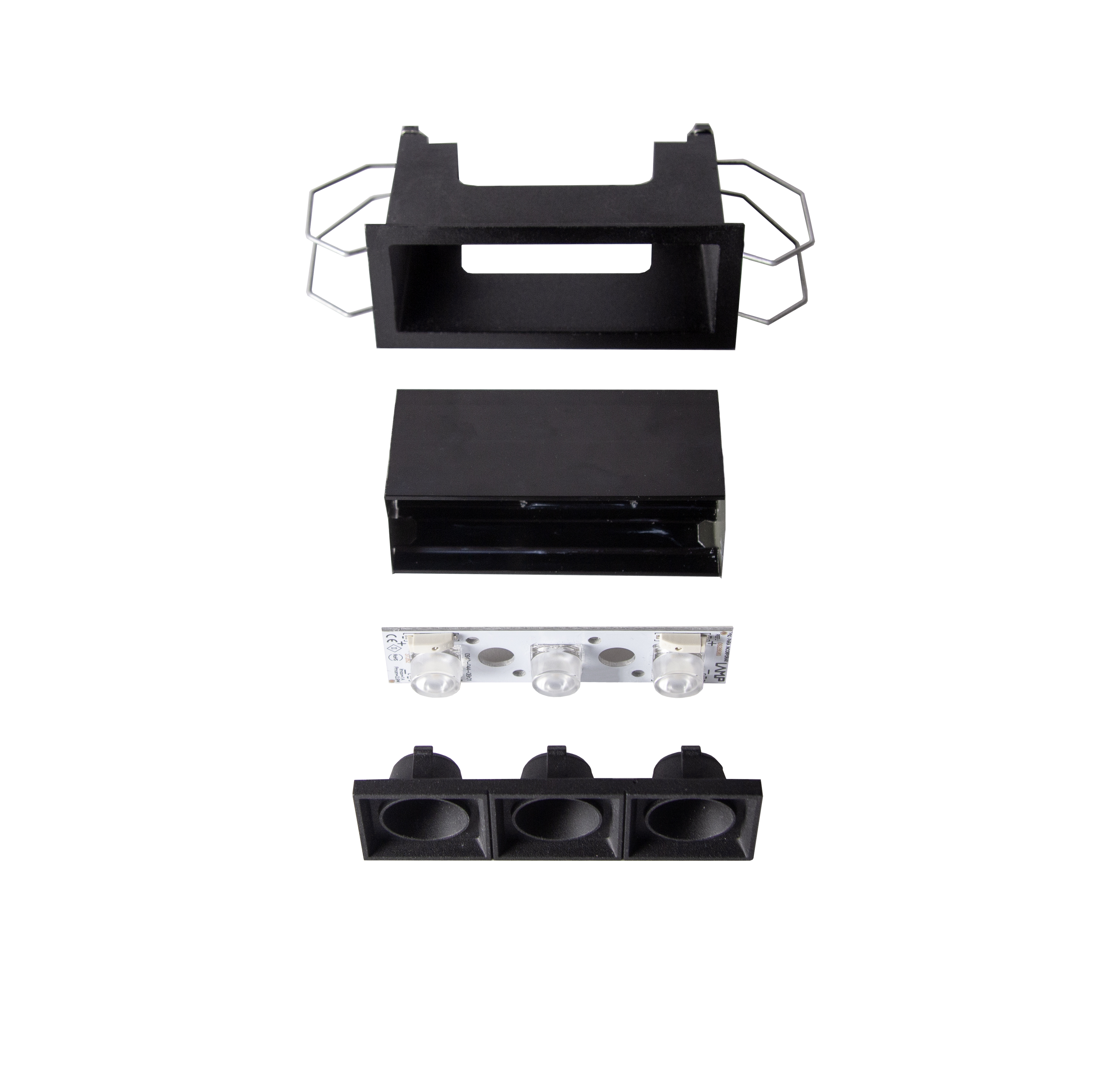 Fixed linear recessed downlight model OCULT, LAMP brand. Body made of anodized aluminium to optimised heat dissipation. External frame made of injected aluminium painted in textured black and reflector made of ABS painted in black matt. With spring loaded clamping system. Model with LED HI-POWER with a warm white colour temperature and control gear included. With Medium Flood optics. Glare rating UGR<10 (for 4h, 8h 70/50/20). IP43 protection rating. Insulation class II.
